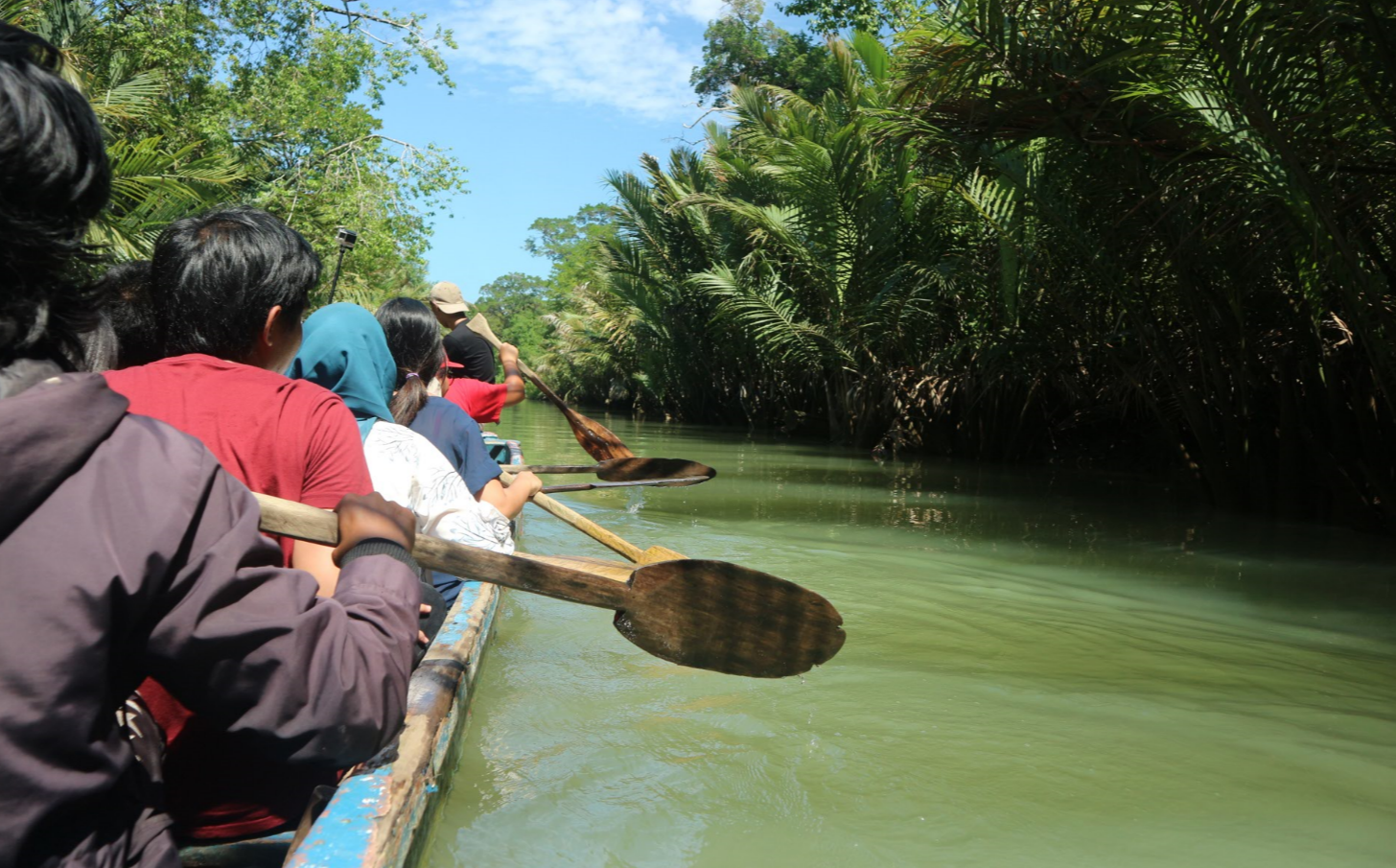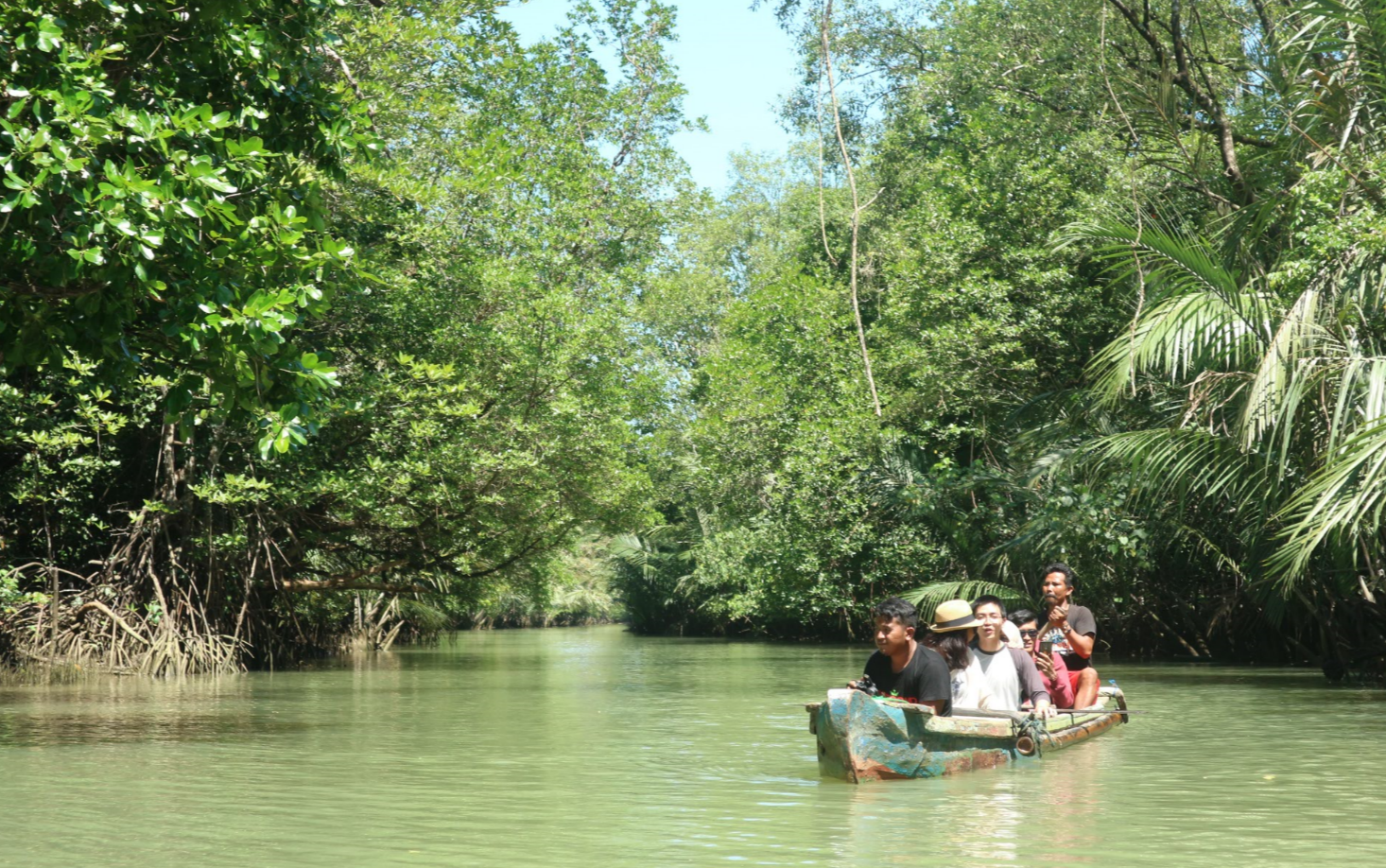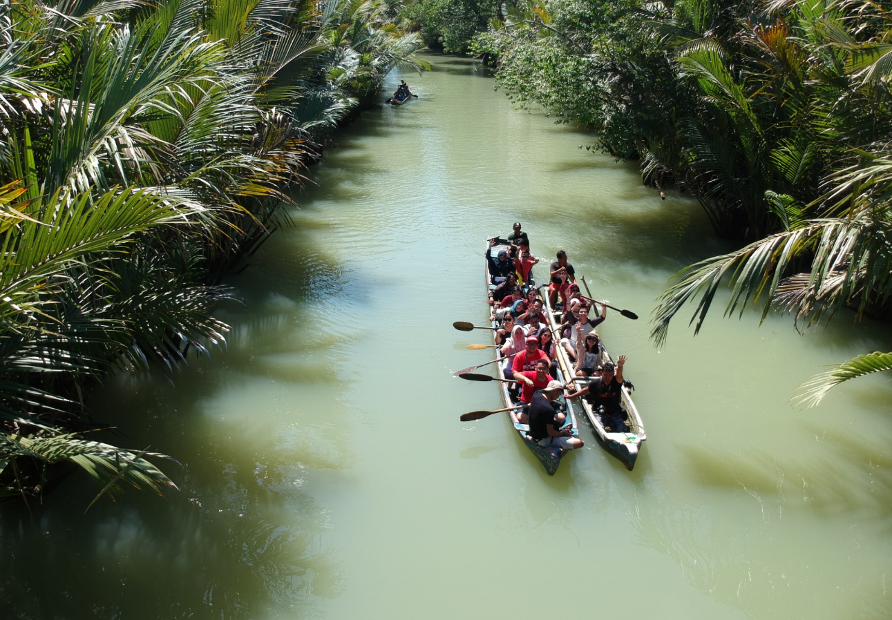 Kanoing dilakukan di antara hutan-hutan bakau. Keren lah untuk spot foto-foto. Deg-degan juga di kano itu walau ramai-ramai secara ngebayang kalau terbalik dan tiba-tiba diserang buaya hihihihi… tapi tenang aja, semua safe, aman karena perahunya kuat, bodyguard-bodyguardnya sigap.