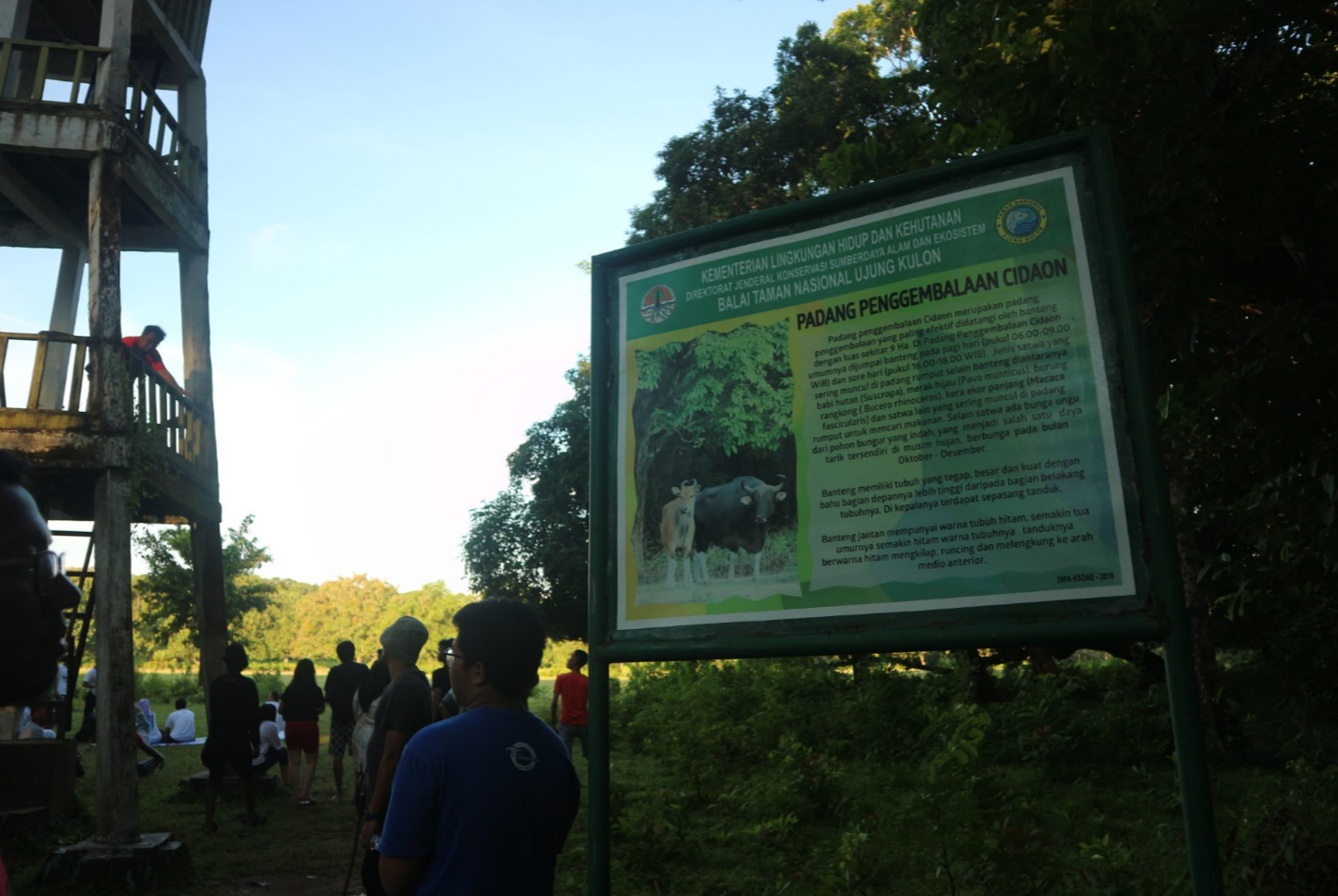 Hanya sekitar 15 menit dari pulau Peucang kita berperahu, menyebrangi laut dikit, sampailah kita di daratan Taman Nasional Ujung Kulon. Tujuannya di sini melihat banteng dan burung merak. Mulai dari turun perahu, kita kudu tracking dulu sekitar kurleb 1 kilo membelah hutan. Hati-hati dengan pijakan kaki selama tracking. Sampai di ujung, kita akan temukan lapangan luas dan sebuah Menara. Di situlah kita berhenti untuk menanti dua mahluk itu. Tidak semua orang beruntung dan berhasil melihat mereka. Kemarin hanya sempat melihat burungnya saja dan itupun dari kejauhan. Untuk bantengnya sendiri, mungkin dia masih malu-malu dengan kita jadinya hanya bayangannya saja yang bisa kita imajinasikan 😊. Kalau nongolpun, kita pasti bingung ngadepinnya kalau dia mulai mau nyeruduk. Nah…