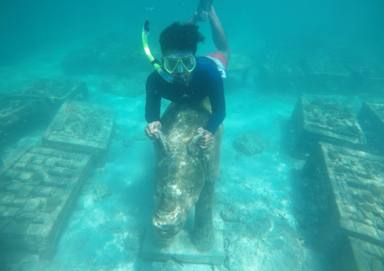 Pulau kecil yang pasirnya kece. Terumbu karang sekitar pulau, terumbunya buatan, sedang dikembangbiakkan dalam laut. Jadi kalau snorkeling di sekitar pulau Badul bisa lihat terumbu-terumbu karang kotak-kotak itu. Dan yang menarik dalam snorkeling di pulau itu adalah ada badaknya. Pastinya bukan badak beneran. Ajaib kalau badak beneran bisa tinggal dalam laut. Yang pasti itu patung badak diletakkan dalam laut.